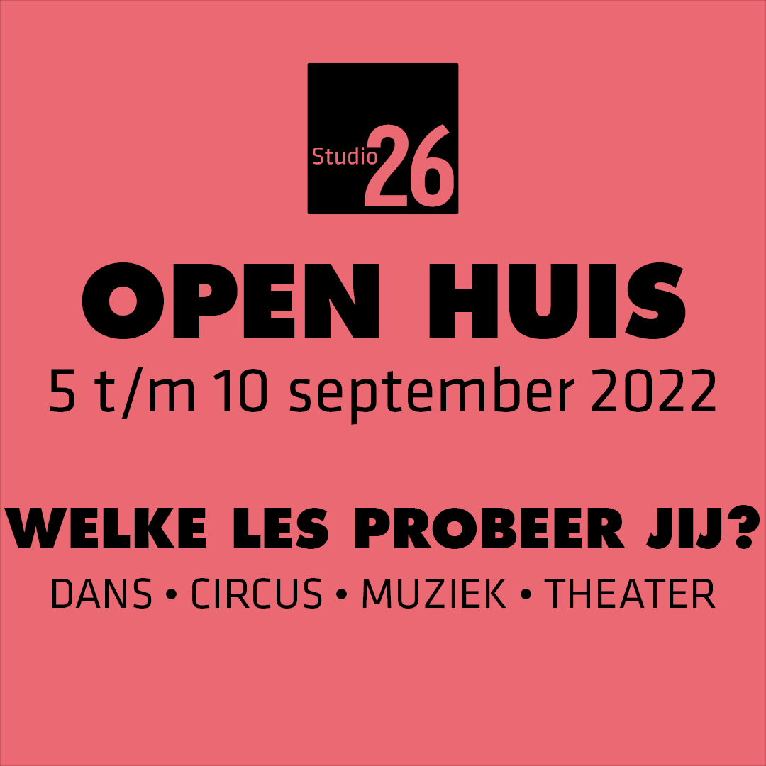 Van maandag 5 tot en met zaterdag 10 september 2022 is Studio26 terug met de Open Huisweek. Graag leren zingen, een les moderne dans volgen of op zoek naar een nieuwe hobby maar weet je nog niet wat je leuk vindt? Tijdens de Open Huisweek maak je kennis met het gevarieerde aanbod van Studio26. Jong en oud kunnen gratis deelnemen aan alle groepslessen dans, theater en circus. Ook kun je je inschrijven voor een individuele introductieles muziek. Hier zijn wel kosten aan verbonden.