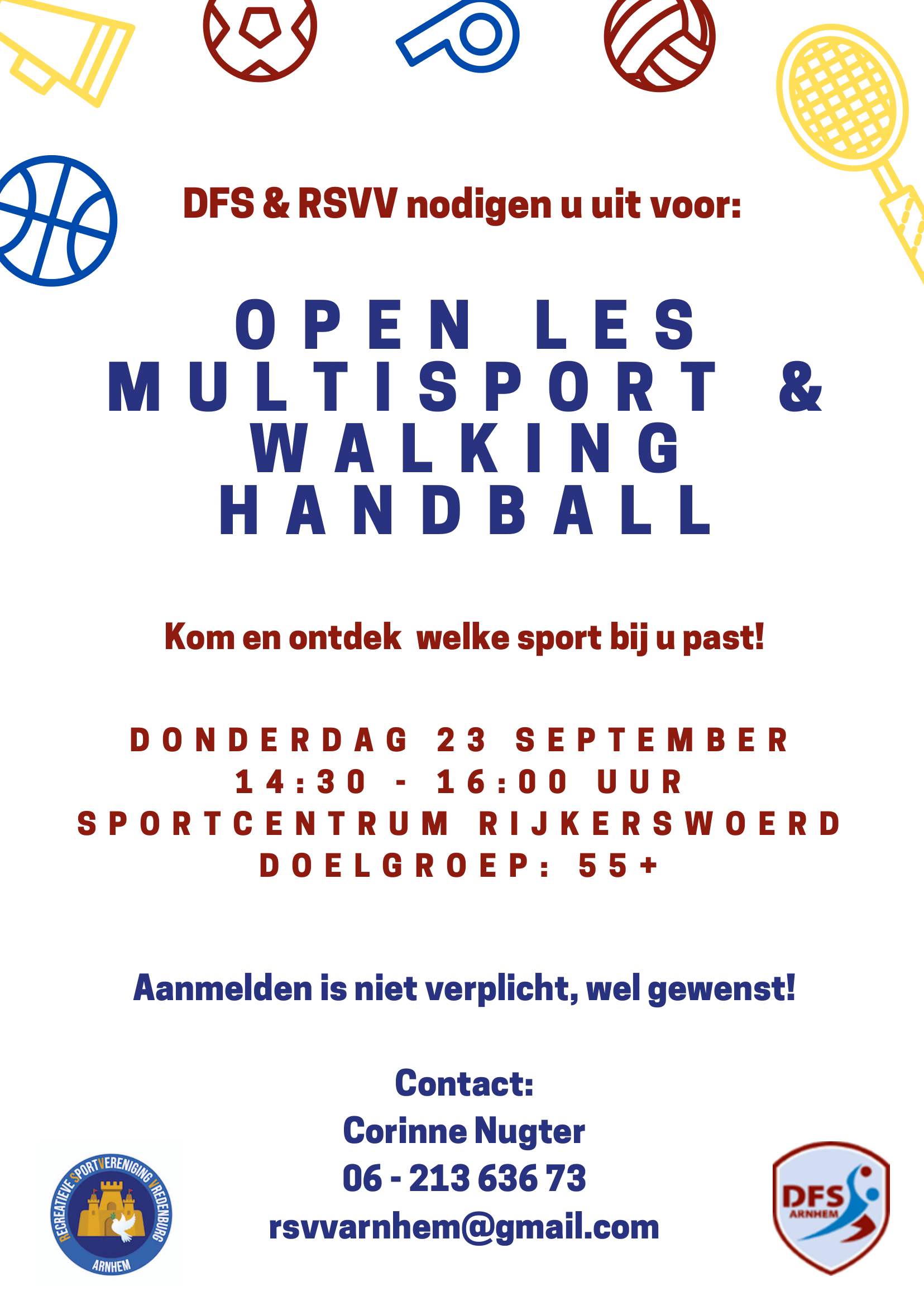 DFS en RSVV nodigen u uit voor een open les multisport en walking handball. Kom en ontdek welke sport bij u past!