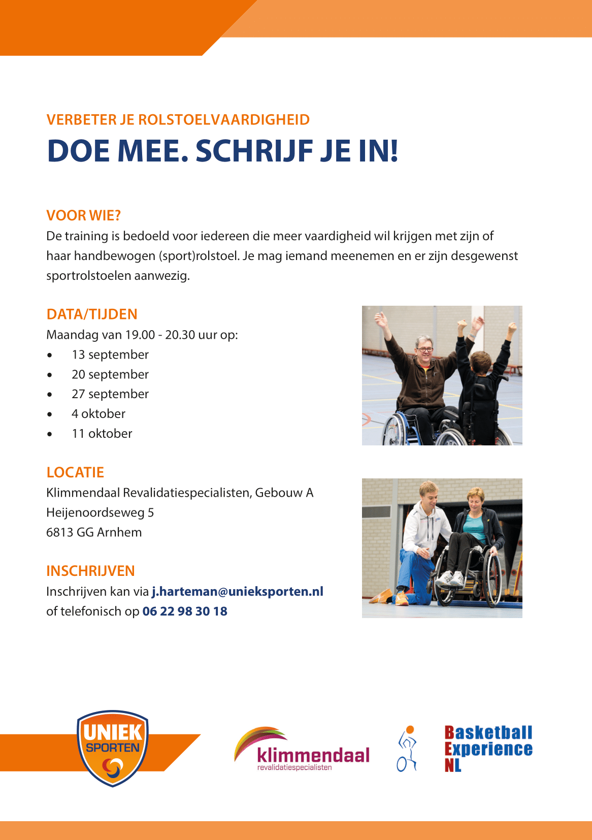 Zit jij in een rolstoel, maar weet je niet goed hoe je ermee om moet gaan? In september 2021 organiseert Uniek Sporten regio Arnhem in samenwerking met Klimmendaal Revalidatiespecialisten en Basketball Experience NL (BEN) een Training Rolstoelvaardigheid en Sport.