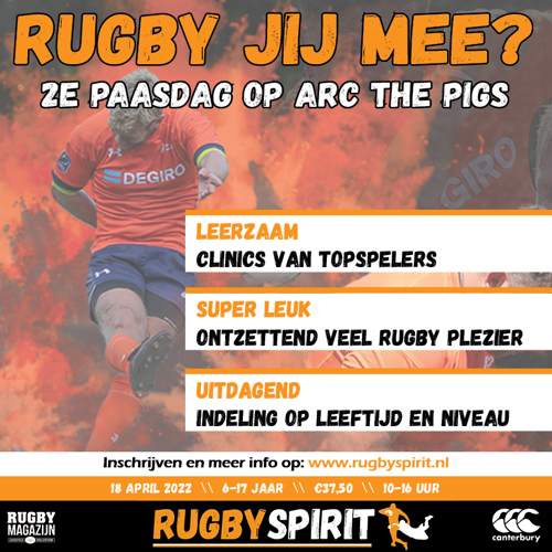 Op tweede paasdag, maandag 18 april, organiseert Rugby Spirit een absoluut fantastische, leuke en leerzame Rugbydag op Arnhemse Rugby club The Pigs. Deze rugbydag zit boordevol clinics en staat onder leiding van ex-bondscoach Mathew Cripps en international Supartie van Heerde.