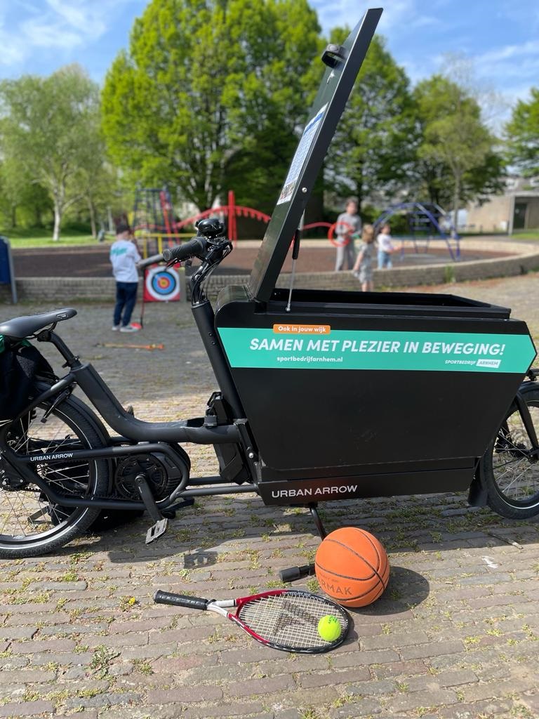 Orlando fietst door de wijk met een bakfiets vol sport- en spelmaterialen. Deze keer fietst hij langs speeltuinen in Rijkerswoerd. Hij zal in de buurt van de bmx baan te vinden zijn.