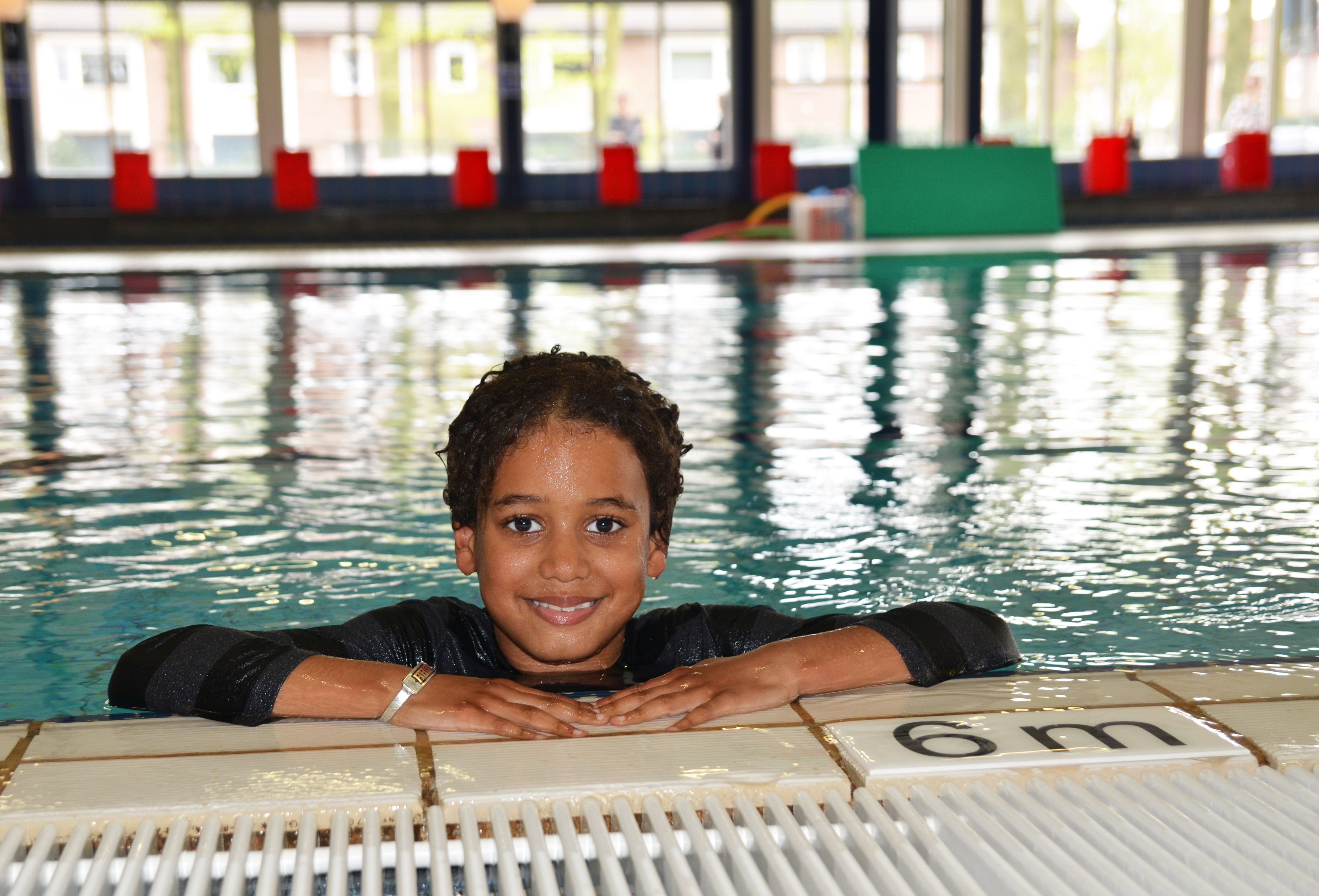Noah staat ondertussen klaar voor de les, met kleren aan. Juf Yvonne geeft de instructies en daar gaat hij: rechtop staan, recht naar beneden springen en dan door het gat. Voor Noah is dit geen probleem en hij komt even later makkelijk weer boven water. Hij is er klaar voor. Volgende week gaat hij vol zelfvertrouwen op voor diploma A!