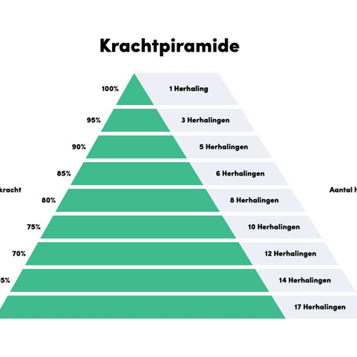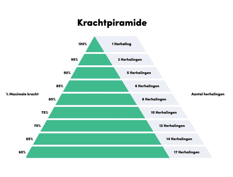 De krachtpiramide is erg handig om bij de hand te houden als je je gaat voorbereiden op je unieke trainingsdoel. Als je traint om sterker te worden train je met maximaal 5 herhalingen en dus minimaal 90% van je 1rm. Om spiermassa op te bouwen train je tussen de 10-12 herhalingen, wat correspondeert met 70-75% van je 1RM. Om het uithoudingsvermogen van je spieren te trainen train je met meer dan 12 herhalingen, waarbij je maximaal op 65% van je 1RM traint, en afhankelijk van het aantal herhalingen nog een stuk lager kan trainen.